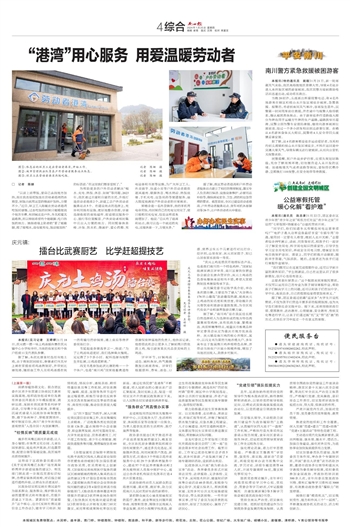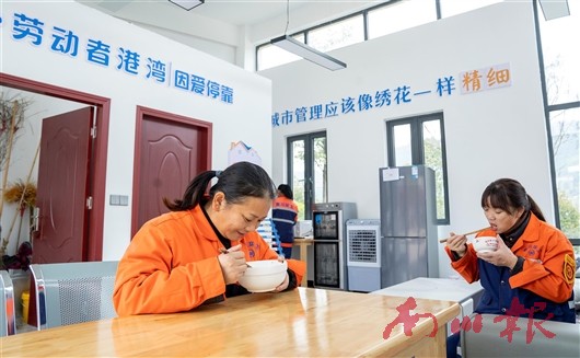 “以前上班带饭,要自己去找地方加热,现在我直接把饭放在劳动者港湾的冰箱里,到饭点就用这里的微波炉加热,方便不少。”近日,环卫工人陈敏在劳动者港湾吃饭时感慨,过去吃饭的时候只能随便找个地方坐着,有时候还是户外,冬天和夏天最难熬,所以特别希望有个能歇脚、吃口热饭的地方。她指着墙上贴着的“累了能歇脚,渴了能喝水,没电能充电,饭凉能加热”的标语说:“在这里我们都享受到了。”