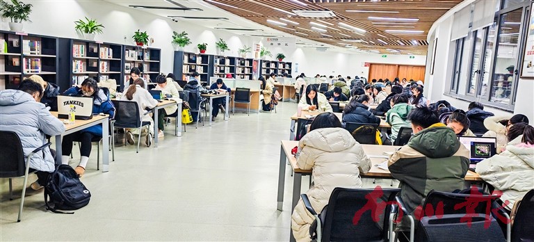 各个阅览室里,几近座无虚席。舒适的学习环境和浓厚的学习氛围,是不少大学生选择在图书馆扎堆“充电”的重要原因。大三学生戴金弘告诉记者,她到图书馆来学习是为下学期的考试做准备。“这里提供热水和暖空调,安静舒适的环境能让学习更高效。”