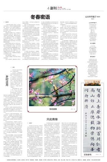 在冬与春交替之际,忙碌了一年,不妨停下匆匆的脚步,静下心来倾听大自然的密语,比如蜡梅花开的声音、荠菜赶超季节的心动、一只喜鹊飞翔时与凉风的拥抱……