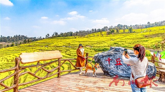 整个3月,明艳的油菜花是春天最靓丽的风景。一朵、两朵、一簇、一片……油菜花像一幅精美的油画,随着高低起伏的地势铺展在山坡地头。微风轻拂下,远处的高山影影绰绰,近处连片油菜花摇曳生姿,它们卷起层层金色的波浪,与蓝天白云相互映衬,游客在花田之中沐浴春风,构成一幅如诗如画的田园画卷。