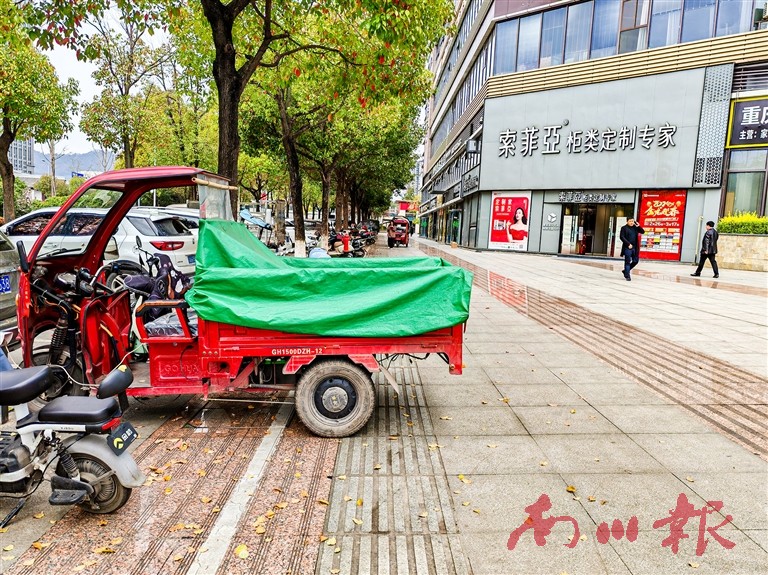 近日,南商广场的盲道被随意停放的三轮车占用,影响群众出行安全。本报记者 摄