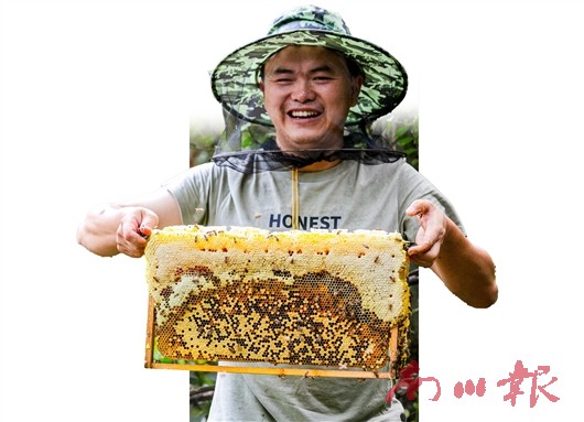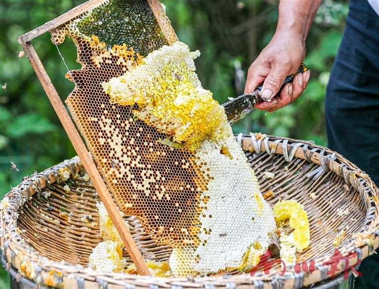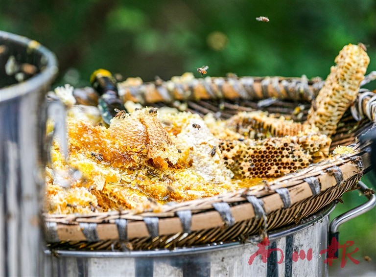 在这片被茂密森林和茫茫竹海覆盖的山林里,一排排蜂箱整齐摆放,成群的蜜蜂忙碌飞舞,蜂农打开蜂箱,蜂巢被蜂蜡密封,蜂蜜在蜂房自然转化成熟。