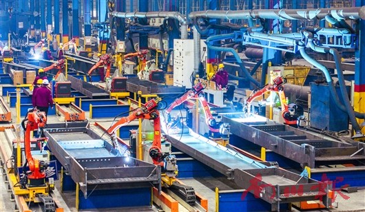 11月20日,在工业园区南平组团鸿路钢构三期“智能工厂”的厂房内,一台台智能机器人正在有序运转。