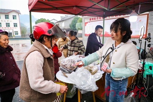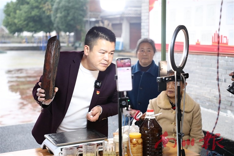 本报讯(见习记者 卢娅玲)“欢迎大家来到我的直播间,这里是古花镇村干部助农直播间,我们这里有熏腊肉、茶叶、黄豆等多种特色农产品,欢迎大家选购下单。”12月4日上午9点,在古花镇太平村党群服务中心大楼前,一场别开生面的“线上赶集”活动通过抖音直播平台上演,不仅让村民栽种和制作的茶叶、干豇豆、黄豆等特色农产品走出大山,更为村民们开辟了一条增收的新路径。