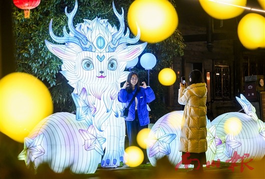 来到天星小镇入口,一尊高6米、宽10米的青女霜雪女神灯饰映入眼帘,以蓝色为主题色的半身冰霜女神朝着游客眨着眼睛,动感十足。同时,两台雪花机在女神两侧营造浪漫飘雪场景。往街道深处走去,白泽、雪羚、九尾狐、青龙、鲲鹏、九色鹿等10组山海经神兽灯展,以及多种小型亮化灯饰装点着古朴的建筑,美轮美奂。