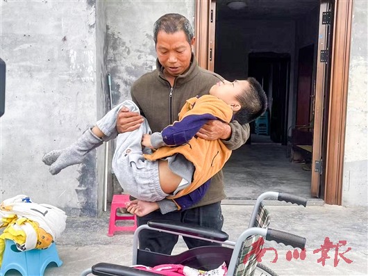 多年来,王邦辉负责外出务工和打听求医途径,妻子在家照顾王冰杰的日常起居。随着夫妻俩年纪的增长,独自照顾王冰杰的生活开始变得困难。从几年前开始,王邦辉无法外出务工,只能留在家里同老伴儿一起照顾孙子的生活,除了日常吃饭洗漱外,还负责喂药、擦身体,偶尔也推着王冰杰出门晒晒太阳。“一楼潮湿,我每天都将他抱上楼睡觉,不过现在他长大了,都快抱不动了。”王邦辉一边抱着王冰杰上楼,一边笑着说。
