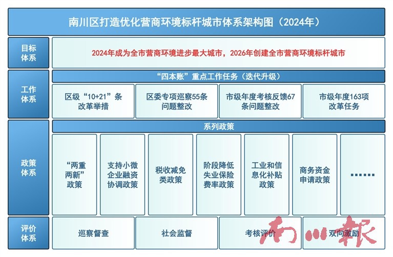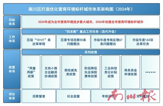 “三个导向”谋划年度任务书。需求导向谋划“特色动作”。通过线上问卷、线下采访以及会议、沙龙、座谈等方式,动态征集企业诉求,滚动建立“营商环境怎么干、企业群众提建议”台账,梳理共性建议、老大难问题等,定向推送区级部门专题研究。2024年以来,围绕政务服务、市场准入、行政执法、政策兑现等方面,先后出台《南川区打造营商环境标杆城市10条措施》《南川区优化营商环境21条举措》,是企业最关心的硬招实招。目标导向谋划“规定动作”。依据《重庆市优化营商环境专项行动方案(2024-2027年)》以及《2024年度工作任务清单》,细化梳理出163条区级任务,印发《南川区2024年优化营商环境工作任务清单》,明确时间表、路线图,打表推进、闭环落实,以一域服务全局,助力全市打造营商环境创新试点城市。问题导向谋划“自选动作”。着力自我革命,开展营商环境区委专项巡察、发现问题55条,叠加市级2023年度营商环境考核反馈67条,集成122条问题短板,逐项明确整改目标、整改措施、完成时限、责任单位,以改促进、以进促优。