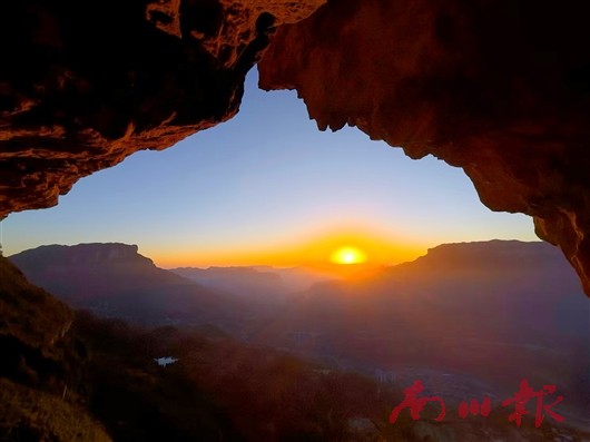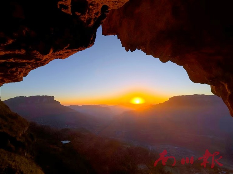 注: 观音洞位于金佛山南坡头渡镇境内,或因洞中有天然观音像而得名,或因观音化坐洞中而得名。此洞悬空于高崖绝壁,洞内秘道纵横,蜿蜒无尽。有支洞数孔临空,坐东向西,似天然佛龛,每值晴日初晨,可见赤轮披金,光芒万丈,金佛、柏枝群峰浴岚、万壑蒸腾,非言语可述也。