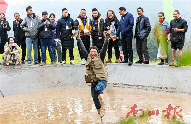田间小道上,游客们漫步赏花,脸上洋溢着惬意的笑容,他们时而俯身轻嗅花香,时而驻足拍照留念,用镜头捕捉这明媚春日里的美好瞬间。不远处,孩子们在家长的陪伴下欢快地放着风筝,五彩的风筝在蓝天白云间翩翩起舞,欢声笑语回荡在花田上空。稻田逐鱼活动同样热闹非凡,人们卷起裤脚,踏入清澈的水中,追逐着活蹦乱跳的鱼儿,体验着最质朴的乡村乐趣。