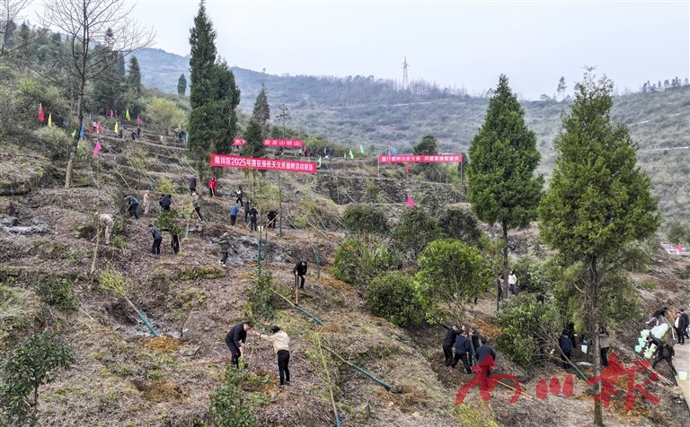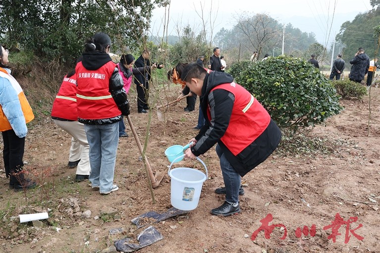 在骑坪村山坡上,志愿者们挥锹培土、扶苗浇水,在专业技术员指导下,将一株株小腿高的蜂糖李树苗植入沃土。