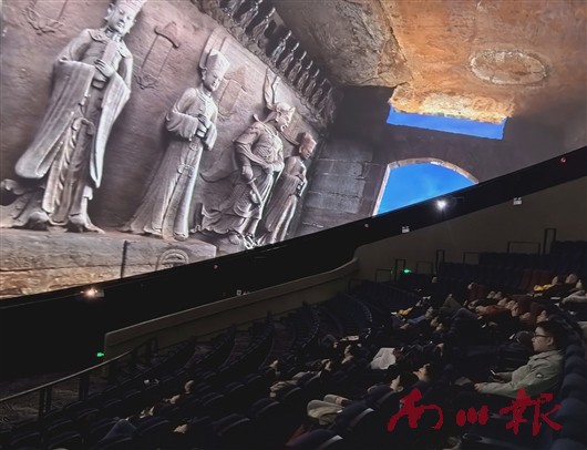 在大足石刻数字展示中心的球幕影院里,观众正经历一场穿越之旅:随着影片展开,8K超高清镜头带人飞越宝顶山全景,“躺”在影院的座椅上便可欣赏“大足石刻”全景。