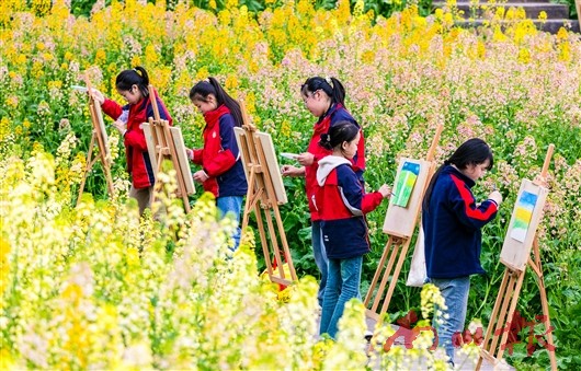 日前,鸣玉镇中心校组织学生来到该镇中心社区向家沟五彩油菜花田,用画笔描绘春日美景。特约通讯员 罗川 摄