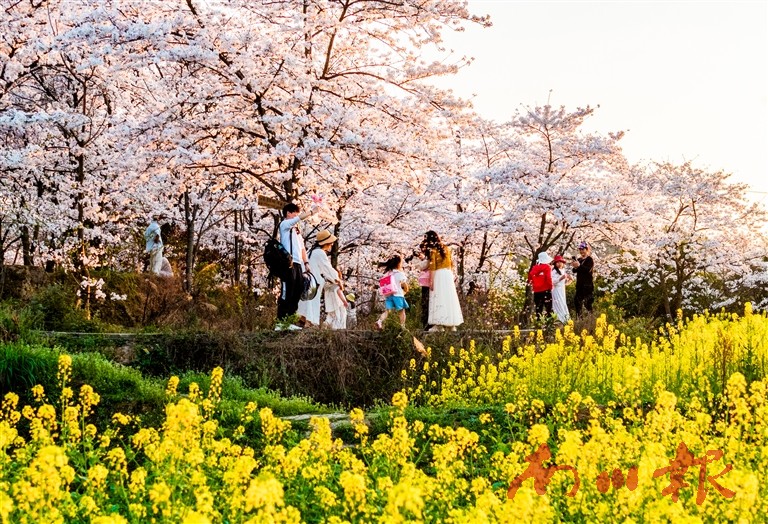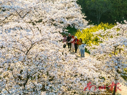 走进樱花园,成片的樱花层层叠叠,微风吹过,花瓣随风飘落,宛如一场浪漫的樱花雨。阶梯状分布的樱花树顺着山势蜿蜒而上,游客们穿梭其间,或驻足欣赏,或拍照留念,令人流连忘返。金黄的油菜花与洁白的樱花相映成趣,更添几分春色。