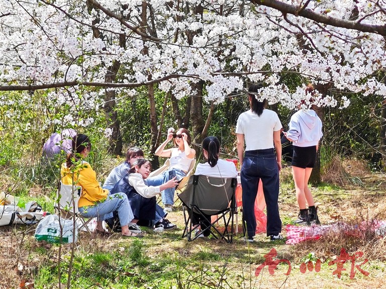 游客陈云娜正与同伴一起享受野餐,她说:“我一直都很喜欢樱花,这次专门和朋友来木凉镇。这里的樱花树很多,花开得又密又盛。坐在樱花树下野餐,一边品尝美食,一边欣赏美景,真的太享受了。远离城市的喧嚣,在这里能全身心地放松,整个人都被治愈了。”
