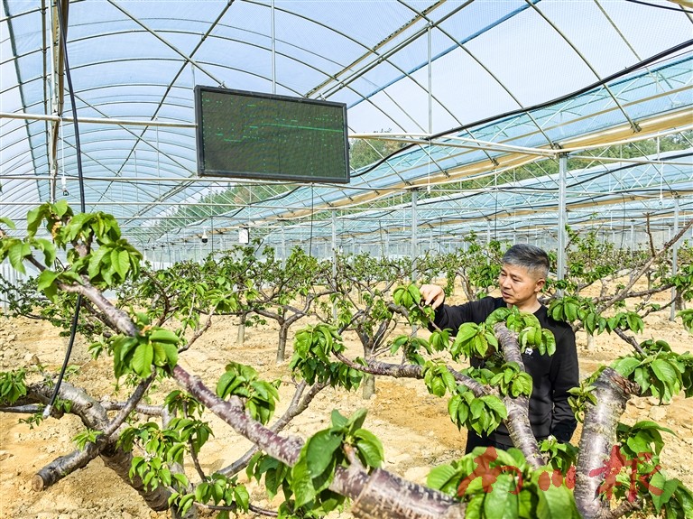 本报讯(记者 邓的)4月8日,山语间农业科技发展有限公司的车厘子种植基地内,智慧大棚的大屏上实时显示着各项数据。这里已完成20亩智慧果园的改造,据预估,改造后该基地车厘子产量将提升30%,人力成本降低幅度超60%。