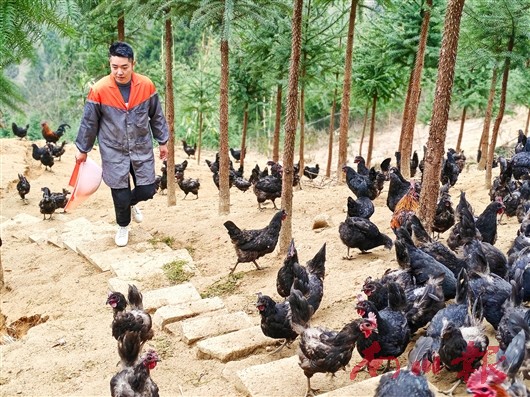 4月10日,踏入大观镇石桥村的大山坡农场,海拔800米左右的杉树林中鸡鸣声此起彼伏。鸡仔们成群结队,或悠然踱步,或低头觅食。一旦察觉有人靠近,它们便扑腾着油亮的翅膀,四散开来,场面热闹极了。