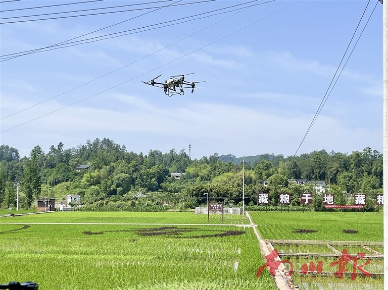 5月26日,在大观镇铁桥村农业科技示范基地内,一场无人机喷洒农药作业有序开展。伴随着一阵阵旋翼转动声,一架植保无人机在操作手的熟练操作下腾空而起,沿着稻田匀速飞行,机身下的喷淋系统喷出白色的雾化农药,均匀地洒向稻田的每一处角落。短短30分钟,18亩农田的无人机飞防工作便顺利完成。