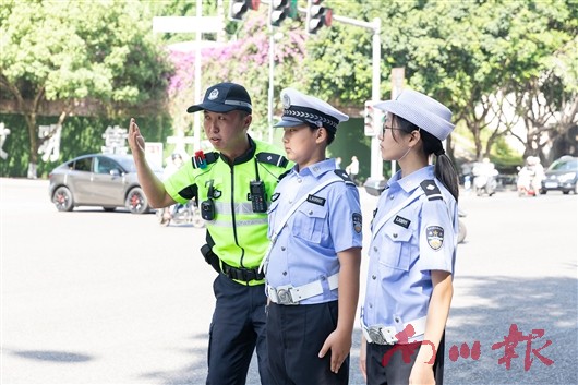 经过集体宣誓、安全培训、交警手势操学习后,少年交警们在交巡警带领下正式上岗,在红绿灯路口开展护校岗实践,对校园周边的车辆进行交通宣传劝导,呼吁学生和家长遵守交通规则,注意出行安全。