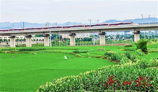 近日,渝厦高铁重庆东至黔江段(以下简称“渝厦高铁渝黔段”)高铁检测车穿越我区田野。