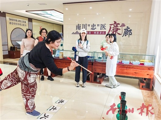 活动现场,达人们聆听了中药师讲解传统炮制技艺及其传承故事,并近距离观摩了药碾、药臼等传统制药工具。活动还设置了“投壶”等趣味传统文化游戏,达人们根据“金木水火土”五行对应的汉字摇色投壶,现场欢声笑语不断。