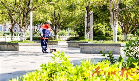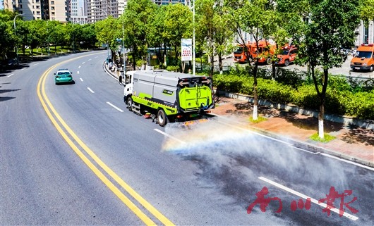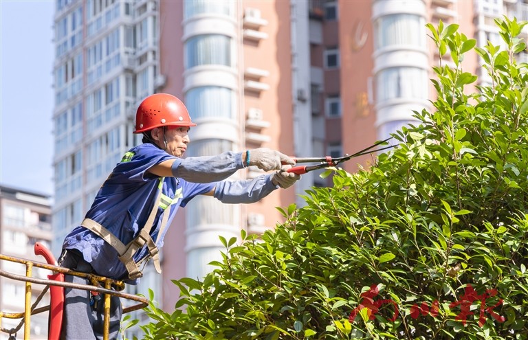 城市里,同样有一群“汗”卫者。环卫工人凌晨便挥动扫帚,在市民广场清扫每一寸路面;市政园林工人手持工具,在金佛北路清理杂草,在金山大道修剪枯枝,消除安全隐患。新能源清扫车穿梭于城区街道,喷出水雾降尘降温,为市民送去一丝清凉。