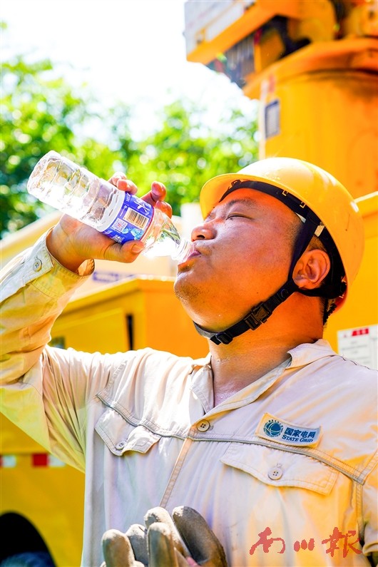 在电网负荷攀升的酷暑中,区供电公司带电作业人员顶着烈日,在10千伏盆龙线、鸣沿线开展带电作业……汗水浸透的工作服下,是他们保障居民用电稳定的执着信念。