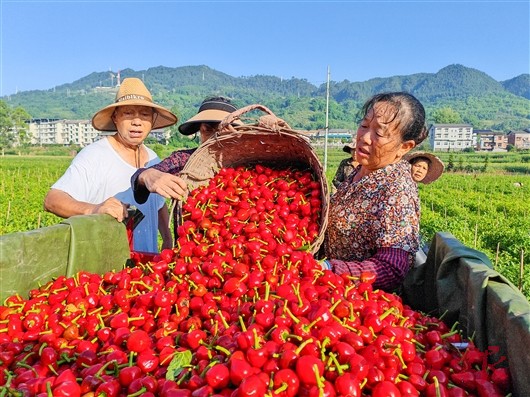 据南川区源生蔬菜种植专业合作社理事长郑洪远介绍,该基地总面积200亩,种植的草莓椒从7月初进入采摘期,将持续至10月底,亩产1500公斤,预计总产量可达30万公斤。这些品质优良的草莓椒主要供给加工厂制成干辣椒,最终销往中心城区各大商超,成为市民餐桌上的美味调料。
