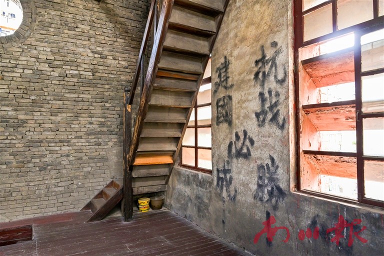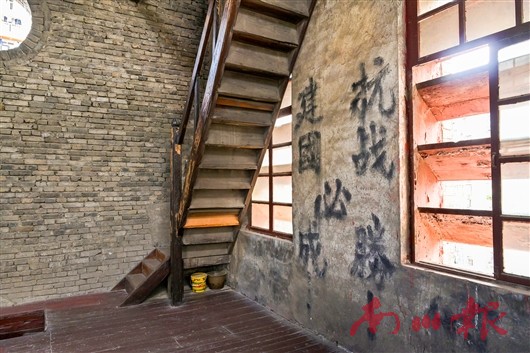 1939年10月,日本飞机轰炸南川,教堂屋面及钟楼受损;1942年,日机再次轰炸县城,钟楼顶层和尖顶被炸毁,大门石柱上的机枪扫射弹痕至今清晰可见。钟楼三层墙壁上留存着“抗战必胜 建国必成”七个30余厘米见方的大字,排列巧妙——从右至左分三行立排,中间一行退至第三字单写“必”字,左右两行第三字空缺,共读中间“必”字,笔力刚劲,墨色入墙,彰显了南川人民的抗战决心。