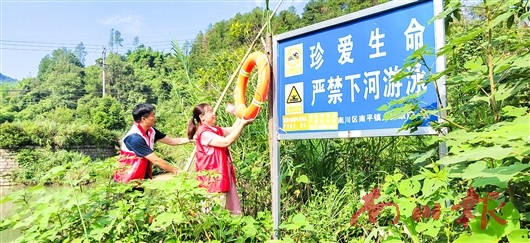 暑期高温,溺水事故易发。南平镇通过每日巡查危险水域,构建“人防+技防”“空中+地面”立体监控,“大小喇叭”高频播报安全提醒,对留守儿童落实“一对一”关爱,拉网排查河流、湖泊、水库、工地水坑等隐患点,在重点水域高标准配备警示牌、救生圈、救生绳、救生杆,提升应急处置能力。