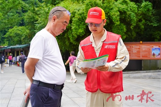 本报讯(记者 张又弋)8月13日,区供电公司在金佛山西坡游客中心开展“电护金佛山 绿织生命线”主题宣传,向游客宣传绿色电力理念与生态保护知识。