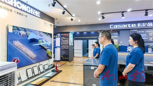 在明润广场商圈的家电城里,各家电商家纷纷将售卖的大屏电视机打开,吸引了不少市民驻足观看,家电商家更为市民们提供了爱心座椅。家电城工作人员许永琴表示:“我们正好有大屏电视,在这个特殊日子,更要物尽其用。通过大屏电视播放大会直播,让大家都能看到我们祖国的强大,也希望我们祖国越来越强大。”