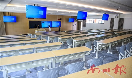 在崭新的教学楼内,教学设备已经安装调试完成,教室根据规模不同,可分别容纳60人、90人、120人和200人,以适应不同类型的课程需求。最引人注目的是,每间教室门外都安装了智能教学系统,学生可以在系统上自助查询每间教室的课程安排,并通过人脸识别或刷卡快速完成自助考勤,还可以通过便捷申请使用教室或相关设备完成资源预约,这不仅提升了管理效率,也让课堂管理更加精准、高效。