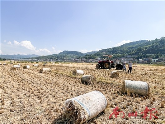 本报讯(通讯员 徐茂权)近日,在东城街道三秀社区的稻田里,拖拉机带动秸秆打捆机将秋收后的稻草压实成捆。这批稻草即将跨越1500公里,运抵内蒙古阿拉善右旗,用于当地防风固沙工程,实现从“田间废料”到“治沙材料”的绿色转变。