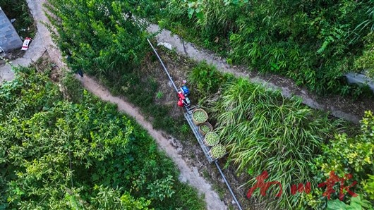 2021年,社区争取专项资金修建了总长超6公里的山地单轨运输线。“小火车”穿梭于果园之间,单次可运果六七百斤,相当于七名壮劳力,每天为每户节省人工成本近4000元,还大幅降低运输损耗。