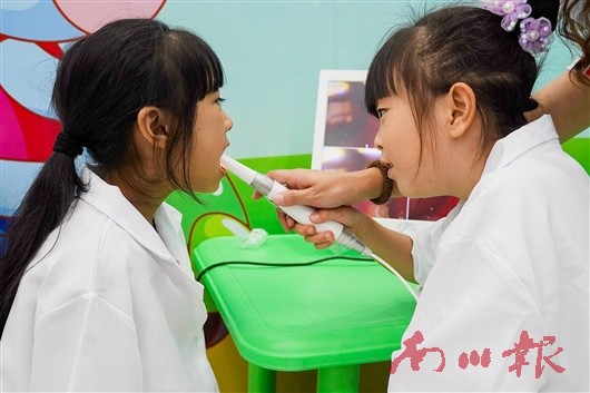 实践环节更是将气氛推向高潮,孩子们手持口腔内窥镜,像真正的牙医一样为同伴检查牙齿:“这里有点黑,要注意刷牙哦!”“你要少吃糖!”现场互动频频,欢声笑语不断。