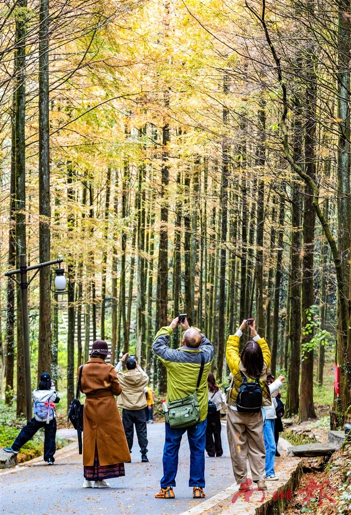 城区藏着温婉。街道两旁的梧桐披上了五彩衣,深绿、金黄、绛红交织着,比山间的林子更添几分精致。市民广场的银杏道又是另一番风味。那些排列整齐的银杏树,通体金黄,像是列队的卫兵换上了盛装。走在落叶铺就的金色地毯上,看孩童追逐嬉戏,听那沙沙的脚步声,是南川此时最平实而温暖的注脚。